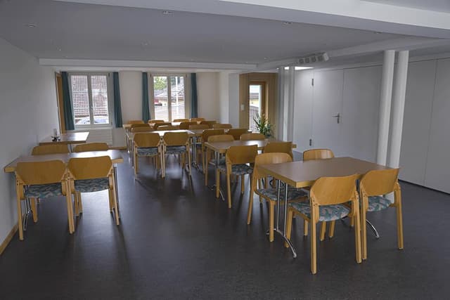 Grösse: ca. 40 Sitzplätze Preis: Fr. 100.-- pro Tag / Fr. 75.-- für halben Tag oder Abend Da die beiden Säle durch eine mobile Wand voneinander getrennt sind, können sie bei Bedarf auch gemeinsam als grosser Saal (ca. 100 Plätze) genutzt werden. Preis: Fr. 200.-- pro Tag / Fr. 150.-- für halben Tag oder Abend Infrastruktur: Toilettenanlage, Garderobe, Aussenkinderspielplatz, Auto-Abstellplätze Küche: Gegen einen Aufpreis von Fr. 50.-- kann zusätzlich die Küche im Michaelshaus inkl. Geschirr (aber ohne Geschirrspüler) genutzt werden.